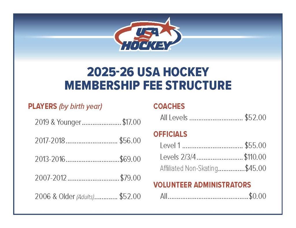 A USA Hockey Registration number is required for all age levels. A new number will be needed each season. Please see graphic above for total cost.